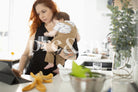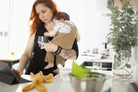 Parent working on laptop while holding their baby