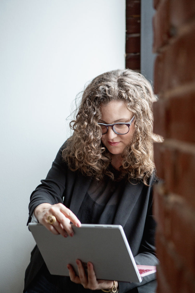 Professional working on tablet by a window